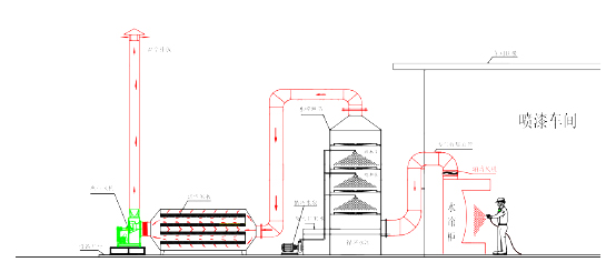 喷漆废气经水喷淋预处理后+活性炭吸附高空排放