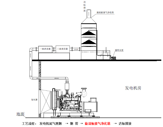 含尘气体、黑烟尾气经烟管进入废气净化塔的底部锥斗,烟尘受水浴的冲洗,经此处理黑烟、粉尘等污染物经水浴后,有一部分尘粒随气体运动,与冲击水雾并与循环喷淋水相结合,在主体内进一步充分混合作用,此时含尘气体中的尘粒便被水捕集,尘水径离心或过滤脱离,因重力经塔壁流入循环池,净化气体外排。废水在循环池沉渣定期清捞、外运。